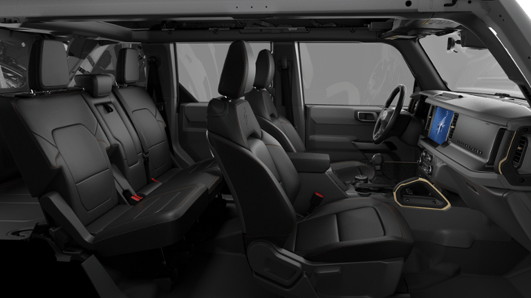 - 100 lbs GVWR; Heated Steering Wheel; Information on Demand Panel; 7-Speed Manual Transmission; Dual-Zone Electronic Automatic Temperature Control; Ambient Footwell Lighting; 2-Door Intelligent Access with Lock/unlock; 17" Carbonized Gray-Painted Aluminum Wheel; Dual Smart Charging USB Ports; 2.3L EcoBoost I-4 Engine; Front Row Heated Seats; Adaptive Cruise Control; B&O Sound System by Bang and Olufsen; Marine Grade Vinyl Heated Bucket Seats; Connected Navigation; Front Parking Sensors; 360-Degree Camera; LT285/70R17 Rugged-Terrain R/T Tires; Sideview Mirrors