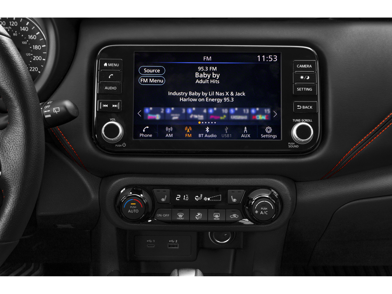 - Radio: AM/FM Audio System -inc: 8" color touchscreen display w/6 speakers, Bluetooth hands-free phone system, streaming audio via Bluetooth, Siri eyes free, audio and Bluetooth steering wheel switches, 3 USB ports (1x front charge and data and 2x rear charge only), type C USB (data and charge) (front), NissanConnect featuring Apple CarPlay, Android Auto, SiriusXM satellite radio w/advanced audio features and hands-free text messaging assistant